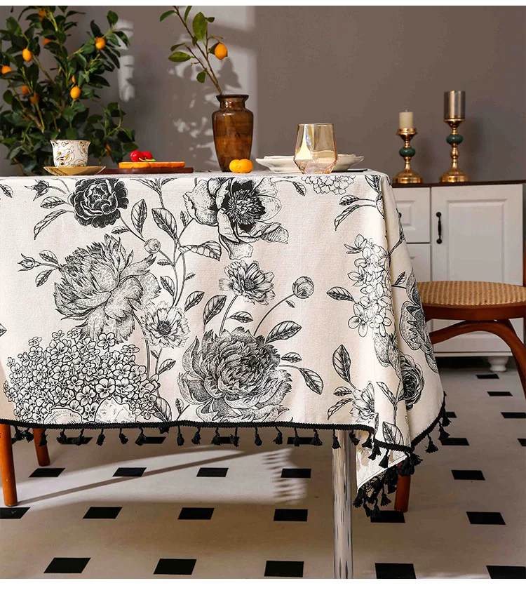Cotton Linen Tablecloth with Peony Tassel Print